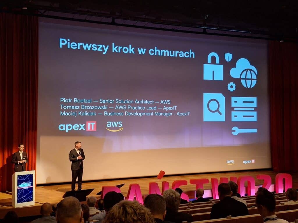 W drugiej części dnia, Maciej poprowadził prezentację „Pierwszy krok w chmurach – studium przypadku”, podczas której wspólnie z Tomaszem Brzozowskim z ApexIT oraz Piotrem Boetzlem z AWS zaprezentowali konkretne projekty klientów ApexIT i AWS. Uczestnicy mogli zobaczyć praktyczne przykłady wdrożeń chmury publicznej, dowiedzieć się, jak bezpiecznie i efektywnie rozpocząć pracę w chmurze, a także zadać pytania dotyczące codziennych wyzwań w implementacji takich rozwiązań. Prezentacja spotkała się z dużym zainteresowaniem i zainicjowała dalsze, interesujące rozmowy w kuluarach.